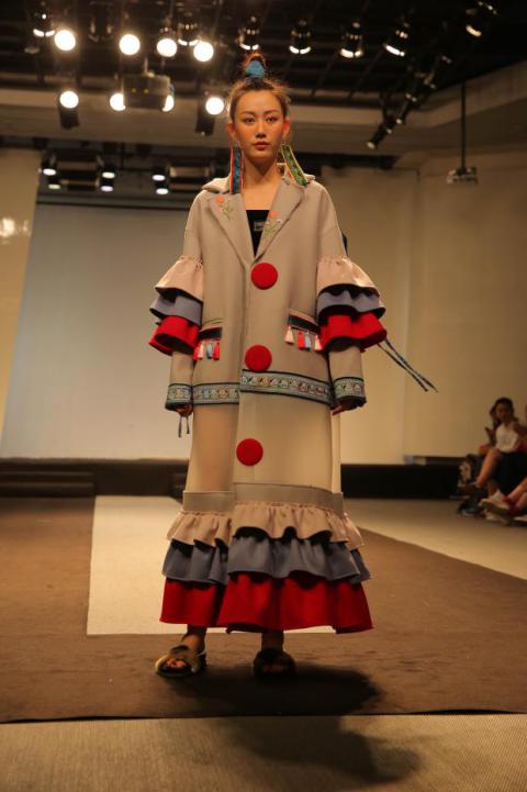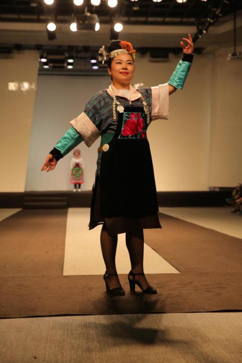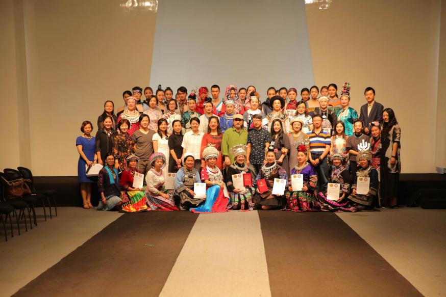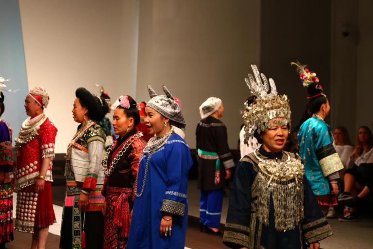 国际化合作是此次研修班的一大亮点。本次结业秀作品由非遗学员、我校服装艺术设计专业学生及英国曼彻斯特城市大学服装设计专业学生三方共同合作完成,高超的手工刺绣工艺与学生们时尚感的设计相结合,完美诠释了“传统与时尚碰撞、传承与创新兼容”的服饰刺绣新风尚,也让此次研培活动成为一个向外国友人展示中国传统文化的媒介,促使中国传统文化通过时尚设计和演绎走向世界舞台。展演中,学员们在T台上亲自演绎了本民族独具特色的民族服饰,绚丽多彩的服饰造型和富有内涵寓意的图案传递着民间文化和传统服饰艺术的精神。活动现场,能歌善舞的学员们唱起贵州当地的民族歌曲,让观众在感受服饰文化魅力的同时,也欣赏到一场原汁原味展示少数民族风情的歌舞盛宴。
