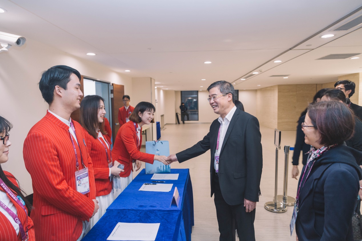 朱民一行先后来到国家会展中心西登录厅、新闻中心,与留学生志愿者、信息部巡查志愿者、运营处会务志愿者、新闻中心志愿者代表亲切交谈,详细了解志愿者们的工作职责、作息情况和志愿服务中的心得收获。他指出,举办进博会是党和国家着眼推进新一轮高水平对外开放做出的一项重大决策,是中国政府坚定支持贸易自由化和经济全球化、主动向世界开放市场的重大举措,为参与其中的大学生志愿者开拓国际视野、培养开放合作精神、增强文化自信提供了很好的机会和平台。朱民对志愿者们践行“奉献、友爱、互助、进步”的志愿精神、展现东华学子良好风貌予以高度肯定,希望志愿者们兼顾好日常学习和志愿服务,努力把进博会开放创新的精神和务实高效的作风融入校园学习生活,让这次志愿服务经历成为珍贵的回忆。朱民还向志愿者们送上由食堂精心准备的志愿者专属点心,叮嘱志愿者们劳逸结合,特别是在立冬之后注意防寒保暖,并要求相关部门加强工作协同、落实保障预案,切实做好志愿者在岗期间学习、食宿、交通、安全等方面的保障工作。