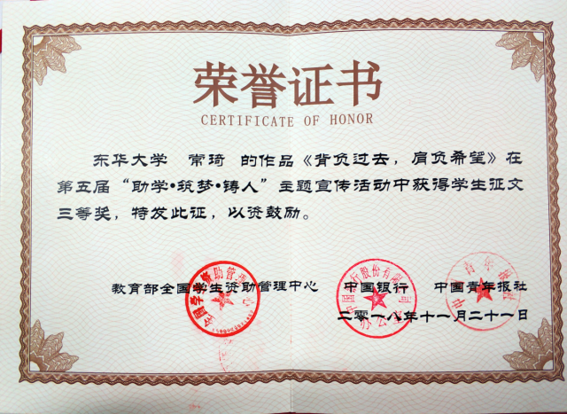 (《背负过去,肩负希望》获奖作品证书)