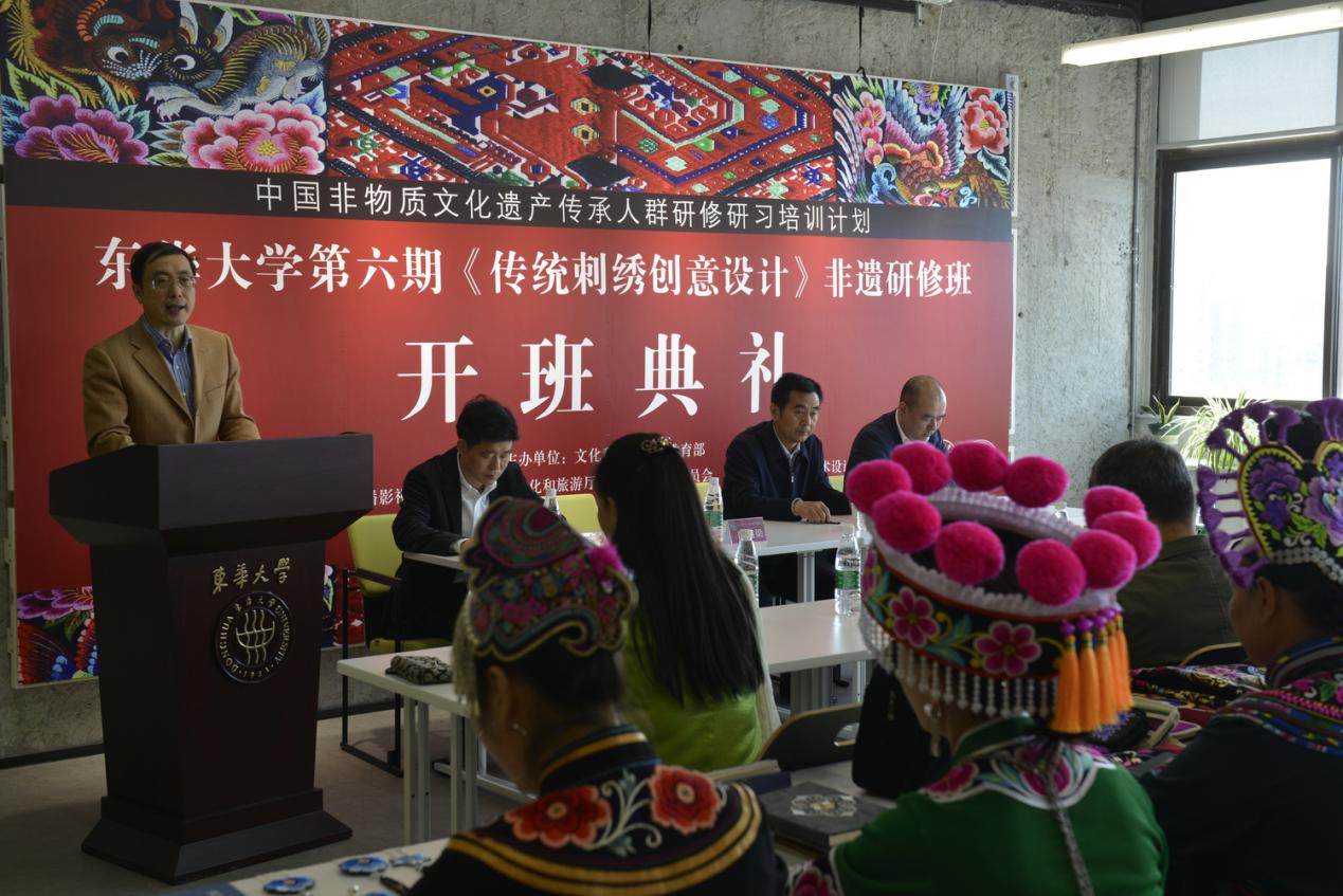 5月7日,久久久久国产成人精品亚洲综合第六期中国非物质文化遗产传承人群研修研习计划《传统刺绣创意设计》研修班在延安路校区开班。副校长陈南梁出席开班仪式,上海市文化和旅游局非遗处、云南省文化和旅游厅、上海社会科学院及我校服装与艺术设计学院、党委宣传部相关负责人和全体非遗研修班学员一同参加活动。