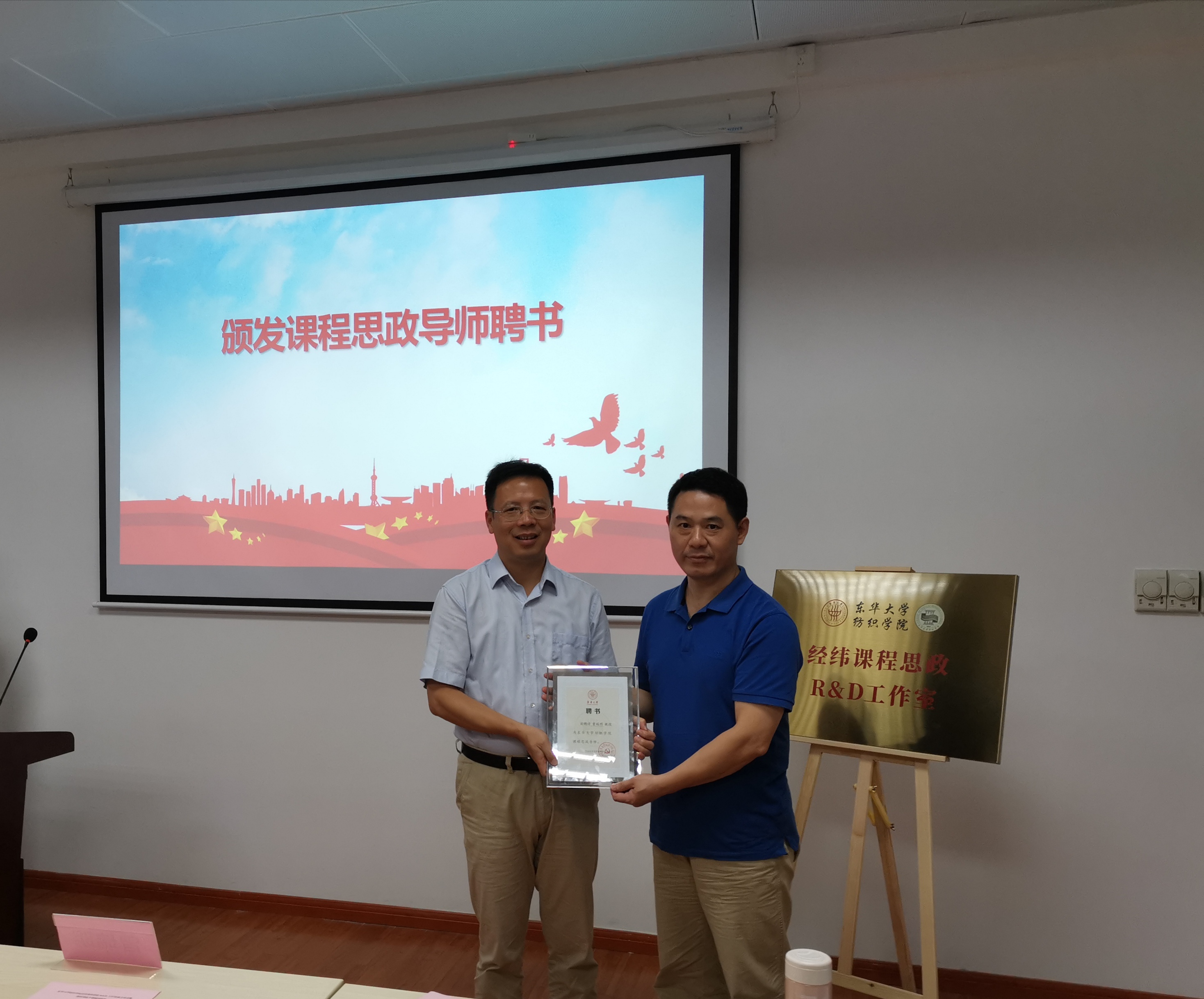 院长顾伯洪为曾瑞明颁发纺织学院课程思政导师聘书,刘雯玮代表学院党委宣读《关于同意成立经纬课程思政R&D工作室的决定》。