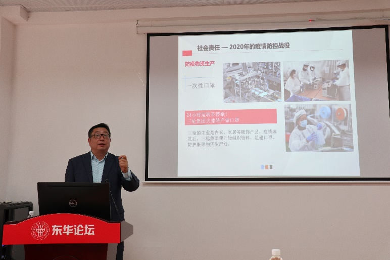 2020年全国优秀纺织企业家,上海龙头(集团)股份有限公司党委书记、董事长,校友王卫民受邀为学院师生作题为“八十余载磨一剑,中国三枪仍少年——从民族纺织品牌的创业成长历程谈未来选择”的专题报告。疫情期间,在防疫物资市场货源告急的情况下,王为民结合企业自身优势,改建防疫物资生产的设备、设施,跨行转产口罩与防护服。他带领全体职工,仅用7天就改造建成隔离服生产线,15天改造建成2000平方米医用防护服洁净车间,11天改造建成第一条口罩生产线,形成50条产能规模,有效缓解防疫物资紧缺的局面,体现出纺织人的智慧与担当。