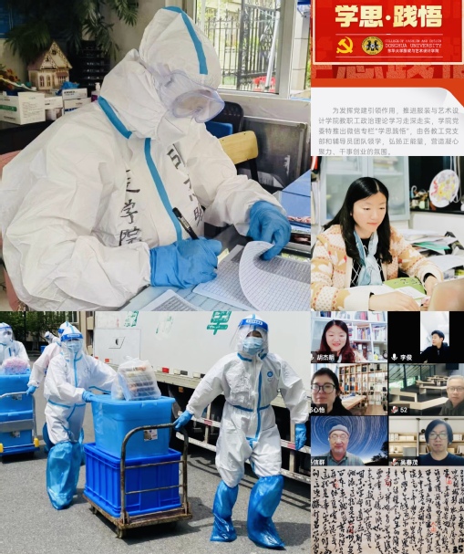 “双带头人”教师党支部书记,服装与艺术设计学院教师胡杰明说“疫情重任复杂严峻,组织需要我,学校需要我,我就要挺身而出,义不容辞。”3月12日起,闻讯逆行返校的胡杰明,迅速加入延安路校区战“疫”保障队伍,负责学生宿舍楼的三餐运送,各类防疫物资的搬运配发,穿上“大白”防护服,如同戴上“党员徽章”,她深感责任重大,使命在肩。在得知宿舍区驻楼志愿者人手不足的情况下,胡杰明毫不犹豫报名,成为驻楼“大家长”,用坚定和奉献,传递抗疫必胜的信念,守护学生健康安全。驻楼期间,除了完成日常的防疫动作和志愿服务工作,她还充分发挥设计专业优势,不仅成功实践“7-1-6-2-3-5-4”十宿工作密码、化解了物资发放与环境消杀的时间冲突,还研究出重点楼栋上门核酸无接触试管发放工作方案,被学校采纳为新的手势规定,不断探索科学防疫“最优解”。此外,胡杰明坚持“支部工作”“线上教学”质量效果标准不降,运用多种方式载体,组织党支部开展“学思践悟”系列学习实践;引导党员教师带头发挥作用,争做“网课能手”;动员系部教师创作抗疫主题作品,以“艺”战“疫”,凝聚人心。