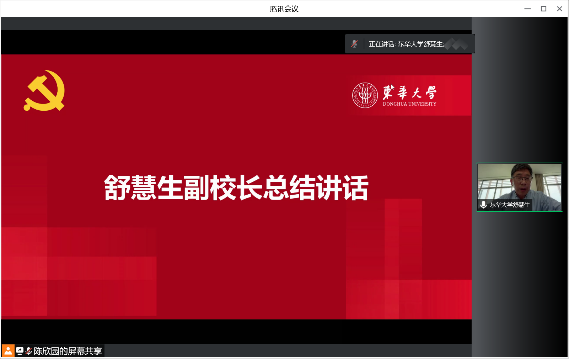 舒慧生对党支部集中组织学习习近平总书记重要讲话精神的学习成果给予肯定,并为党支部在学校疫情防控期间发挥出的党支部战斗堡垒作用和党员先锋模范作用表示赞许。他结合习近平总书记在庆祝中国共产主义青年团成立100周年大会上的重要讲话精神以及关于疫情防控工作的重要指示批示,勉励学生党员要提高政治站位,坚定不移听党话、跟党走,在思想和行动上自觉与党中央保持高度一致,切实增强政治自觉、思想自觉和行动自觉;要争当模范先锋,带头践行疫情防控要求,积极投身抗疫志愿服务,主动关心帮助身边困难同学,协助学校做好疫情防控保障工作;要胸怀“国之大者”,坚持实学实干,担当时代使命,勇于到新时代广阔天地中去施展抱负、建功立业,在祖国和人民最需要的地方绽放青春。